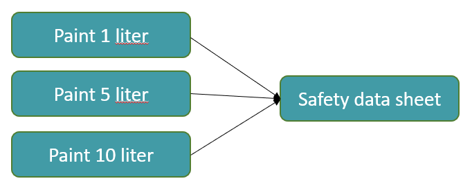 When selling a product with various sizes, such as paint in 1 liter, 5 liters, and 10 liters, your ERP system might assign three different article numbers. Despite the different sizes, they contain the same chemical mixture, resulting in a single safety data sheet.