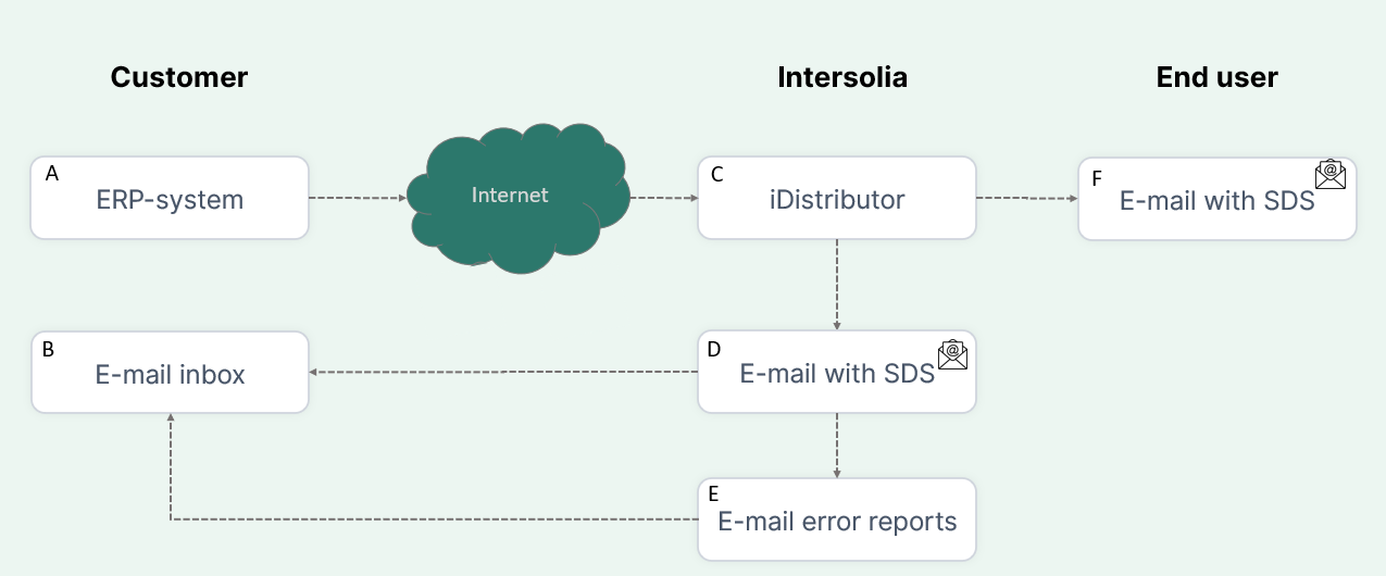 The workflow starts with the customer's product purchase, which triggers registration in their ERP-system (A). Subsequently, the customer consistently sends all purchased products to iDistributor (C), which monitors the sending of safety data sheets.